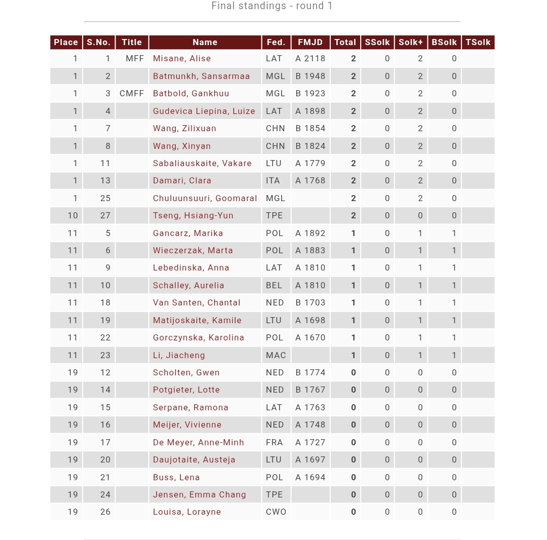 Morgen (zaterdag 25 oktober) staan ronde twee en ronde drie op het programma. De loting voor de tweede ronde is reeds bekend. Gwen zal om 09:30 uur spelen tegen Jiacheng Li uit Macau. Li speelde vandaag remise tegen de Belgische Aurelia Schalley en scoorde daarmee 1 punt. De stand na de aanvangsronde is als volgt: