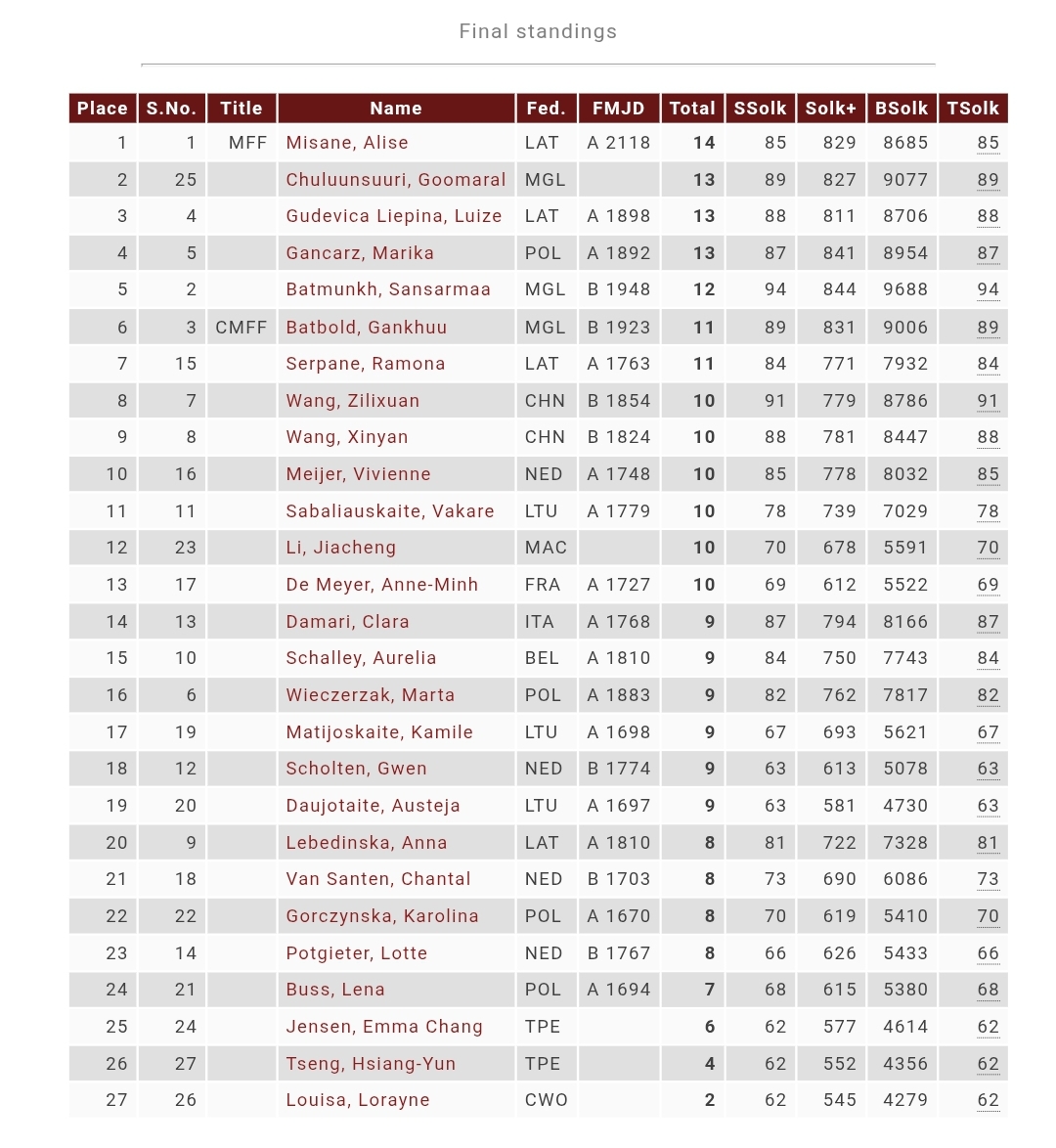 Met 9 punten uit negen speelronden is Gwen op de 18de plaats van het klassement geëindigd. Fleur speelde haar laatste pot remise, waardoor ze tweede is geworden in de categorie Junioren Algemeen. Ook Yulia liet een punt liggen in haar negende wedstrijd en eindigde met een vierde positie helaas buiten het podium.