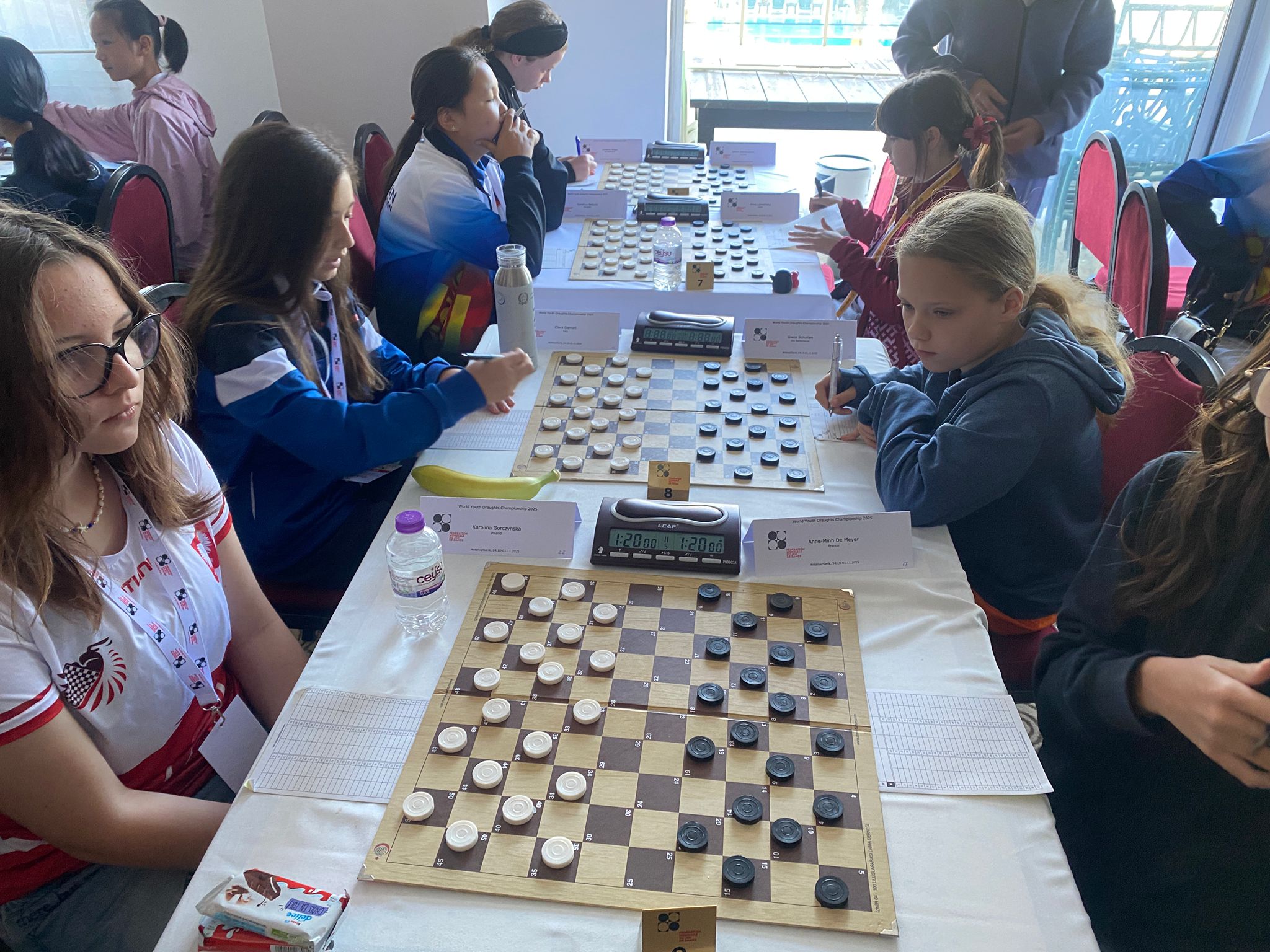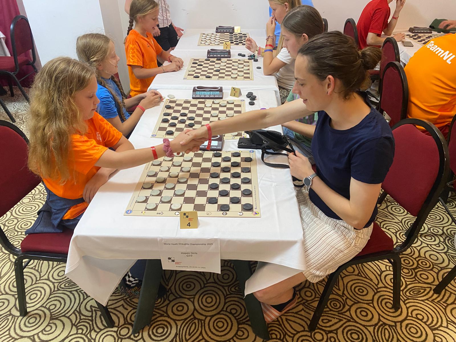 Het klassieke toernooi is gespeeld en de spelers hadden de middag tijd om te ontspannen, maar ook om zich voor te bereiden op het WjK Rapid, dat morgenochtend zal beginnen. Het is een flinke omschakeling om van T80 + 1” naar T15 + 5” te gaan. Nadat Gwen met teamgenoot Viviënne het dambord tijdelijk had ingeruild voor een tafeltennistafel en de schijven had verwisseld voor pingpongballen speelden de spelers van het Nederlandse team partijtjes van T1 + 5” tegen elkaar om aan het nieuwe tempo te wennen. Na het avondeten was de prijsuitreiking van het WjK Classic en kort daarna ging de speelster van DCH naar bed. Morgen wordt immers een zware dag.